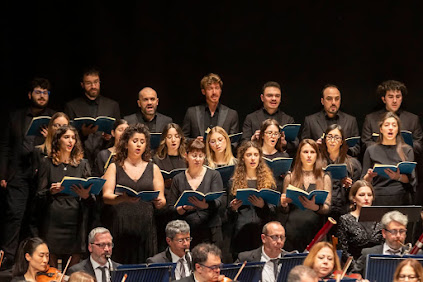 E quando sembrava che nulla potesse aggiungersi a tanta pienezza, è giunto l’Ave verum corpus. Non previsto dal Requiem, ma ad esso legato come un’eco segreta, un frammento di cielo che si apre tra le nuvole. In quel momento il teatro si è fatto culla, respiro, vertigine dolce. Le voci e gli archi si sono fusi in una preghiera sospesa, che pareva non chiedere nulla, ma solo accarezzare l’anima. Era la tenerezza del divino che si abbassa, che si fa corpo – come dice il testo – “nato da Maria Vergine, davvero sofferto e immolato sulla croce per l’uomo”. E in quel suono così puro, così disarmato, ciascuno ha potuto sentire qualcosa che non ha nome: una presenza, un perdono, una carezza per ciò che dentro di noi resta inconsolabile. Un momento celestiale, che ha fatto brillare gli occhi anche ai più silenziosi. Come se per un istante, davvero, fossimo stati tutti abbracciati da qualcosa di più grande, e infinitamente buono.